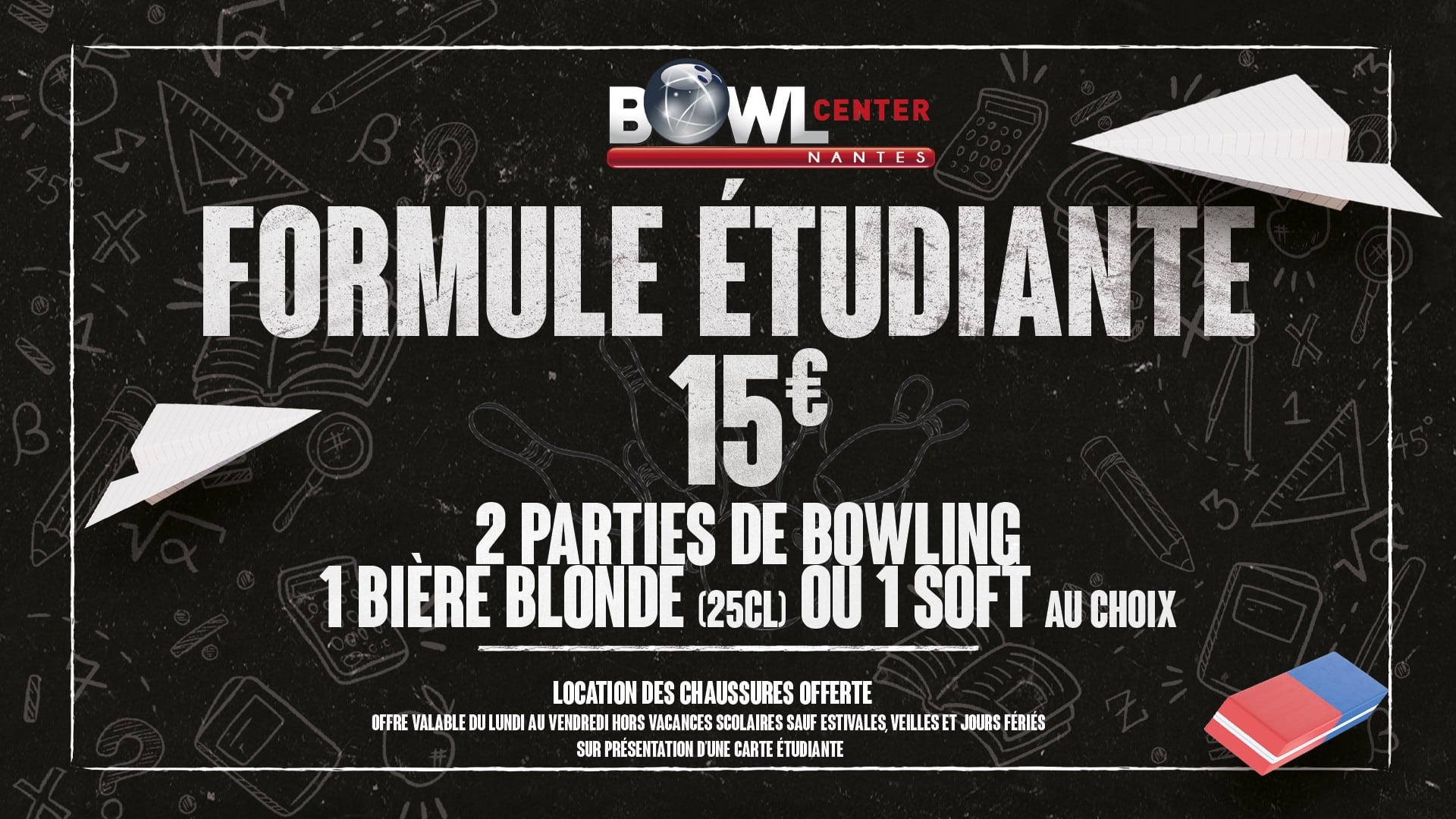 Offre valable du lundi au vendredi hors vacances scolaires sauf estivales, veilles et jours fériés sur présentation de la carte étudiante.